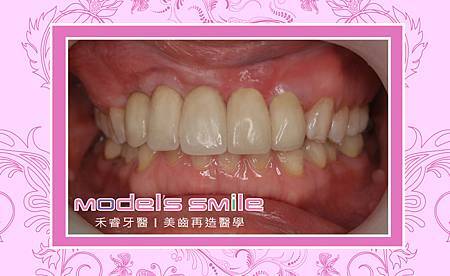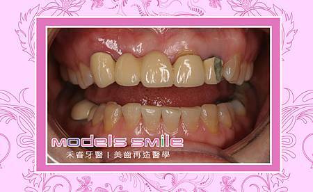 羅小姐長期在百貨公司上班,多年前上班途中發生意外,激烈的撞擊造成前牙斷裂。當時緊急找牙醫以金屬瓷牙做為膺復假牙;沒想到幾年後,前牙牙床骨居然萎縮,而做為架橋的牙根不慎蛀牙也引發假牙鬆脫掉落,需做前牙重建!